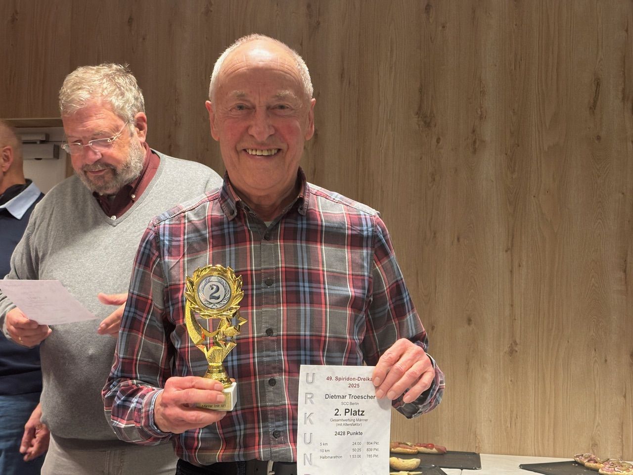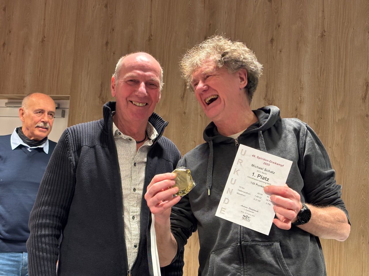 Auszeichnung: Alle erfolgreichen Teilnehmer des Spiridon-Dreikampfes erhalten eine Urkunde und die kompletten Ergebnisliste. Für die Gesamtsieger männlich/weiblich gibt es Pokale, die Altersklassensieger erhalten Medaillen.
