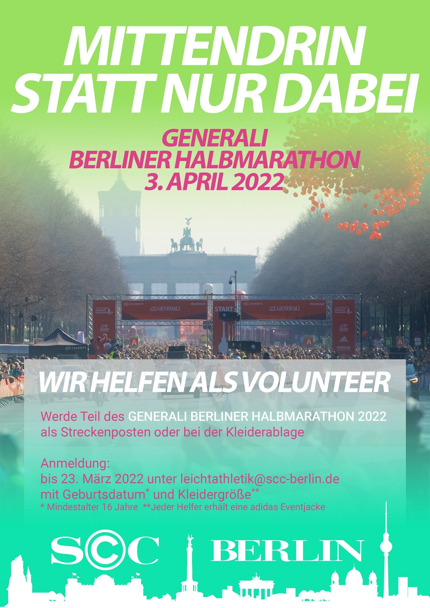 Am 3. April ist es wieder soweit. Die Straße füllen sich, wenn es wieder 25.000 Lauffreunde und Lauffreundinnen auf die Strecke des GENERALI BERLINER HALBMARATHON 2022 zieht. Damit sie, worunter sich auch viele SCCerInnen befinden, ein erfolgreiches Event erleben können, sind Helfer unerlässlich. Aus diesem Grund werden wir als Volunteers die Organisatoren der SCC Events unterstützen. Als Streckenposten, wo wir neben der Absicherung der Strecke auch die LäuferInnen anfeuern können oder bei der Kleiderabgabe, wo wir die Aufregung vor dem Start oder die Freude nach dem Zieleinlauf hautnah miterleben können. Sei auch du dabei, wenn wir als SCC Leichtathletik&Triathlon nicht nur auf der Strecke, sondern auch neben der Strecke eine starke Präsenz zeigen. Jede helfende Hand wird benötigt, auch Freunde und Familie der TeilnehmerInnen sind herzlich eingeladen Teil des SCC-Helferteams zu werden!